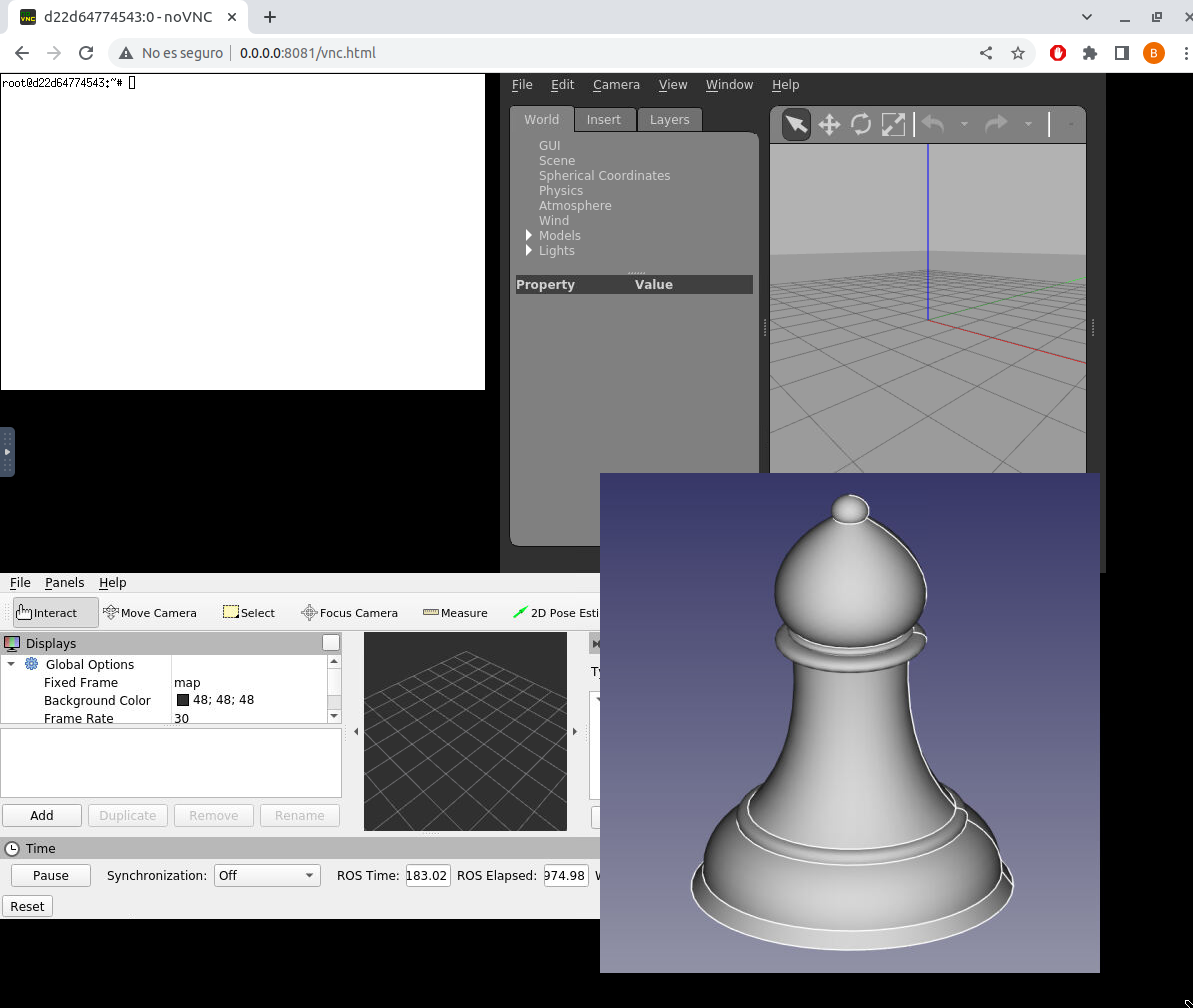 Con esta imagen docker y abriendo un servicio VNC en el puerto 8081 he conseguido ejecutar 4 aplicaiones dentro del docker y visualizarlas en un browser. Estas 4 aplicaiones son Gazebo, Rviz, una consola y un porgrama sencillo en python que muestra una imagen de un alfil en OpneCV: